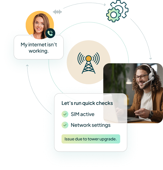 No more scrambling for plan details or roaming policies. Our Agentic AI listens, guides, and automates workflows (whether it’s resolving a billing dispute, activating a new number, or explaining international data roaming) so agents deliver accurate, personalized solutions in record time.